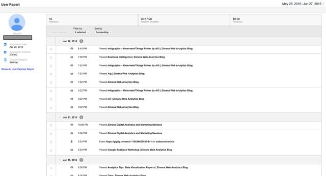 For an example, I am showing an image reflecting a user activity of my company’s blog (with client ID blocked in the upper left). In it, the user viewed a number of post, generated page views. But in the fourth and seventh sessions, the user also clicked on video links in the blog content.