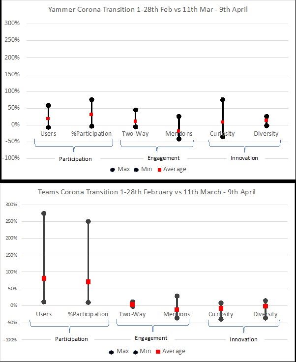 - The Teams data is most reflective of WFH transitioning, with the % change in participation varying from as little as 11% up to more than 250%, suggesting a large variance in the speed of transition. The comparable Yammer ranges are: no change to up to 75%.