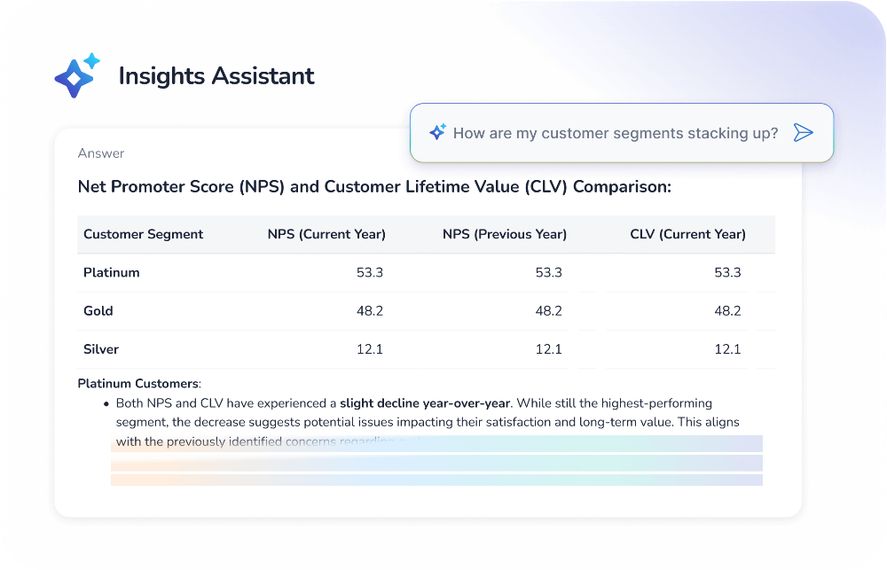 Medallia’s Insights Assistant enables users to ask plain-language questions and instantly generate contextual analytics, including segment-level NPS and CLV comparisons, directly within the platform.