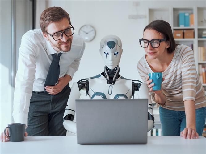 A humanoid robot sits at a desk working on a laptop while two human coworkers lean in beside it, smiling and observing its screen during a collaborative office session.