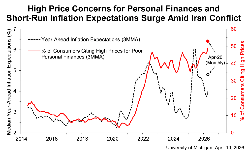 Another, bigger question is what will it take to restore consumer confidence? You can safely bet that a lot of folks who never paid much attention to Michigan’s consumer benchmarking will be sitting up and taking notice when the May reading rolls in. The April surveys were nearly completed before the April 7 US-Iran cease fire with was announced, a data point that may have buoyed some people’s sentiment.