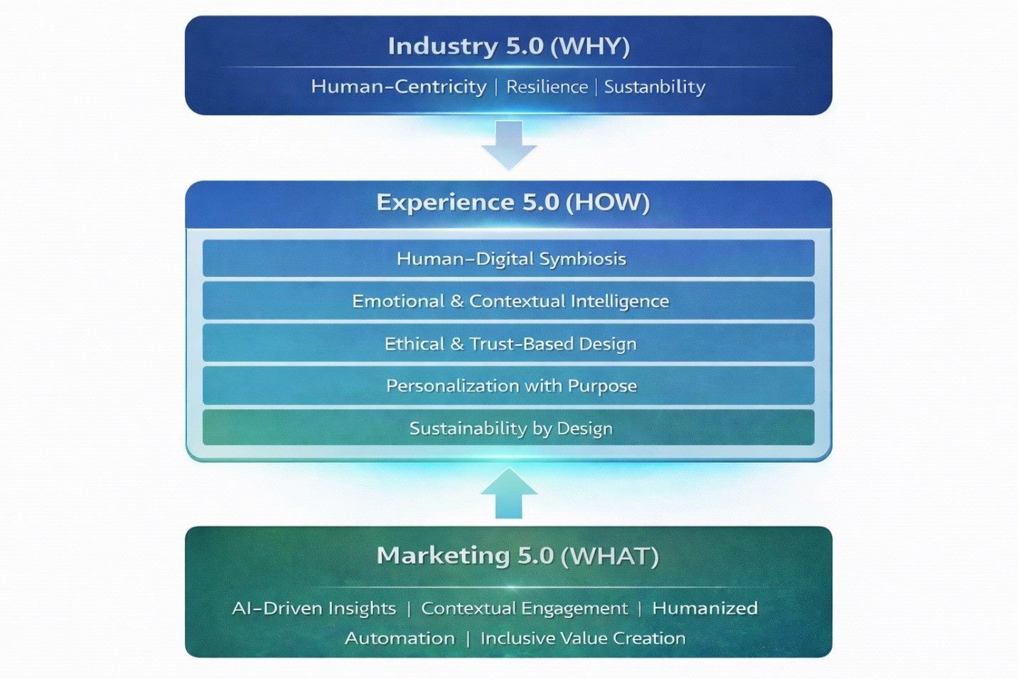 - Experience 5.0 is the missing connective layer. It translates Industry 5.0 values and Marketing 5.0 capabilities into coherent, ethical, emotionally intelligent experiences across customers, employees and society.