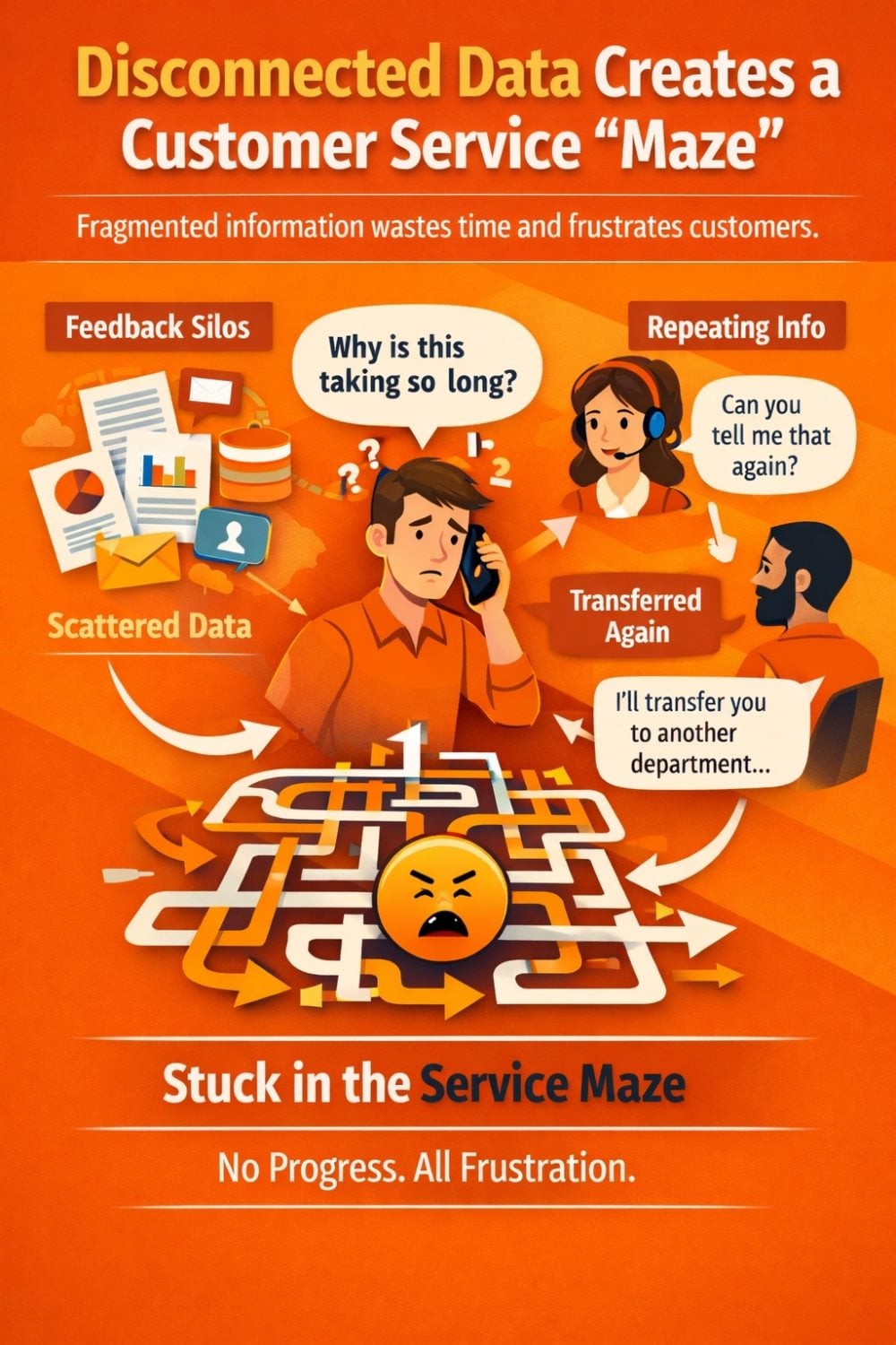For this to happen, customer feedback data needs to be organized and given context. Disconnected silos of data simply complicate and confuse the work of a customer service team; seen in practice as customers having to repeat themselves or wait as the agent tracks down the necessary information, or worse, passes them to another department. The cumulative effect is the creation of a customer service "maze" where the customer feels little meaningful progress is being made towards a fix.