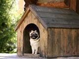 Pug dog in a dog house.