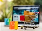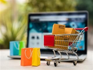 Mini shopping cart holding small cardboard boxes sits in front of an open laptop displaying an ecommerce website, with colorful shopping bags nearby.