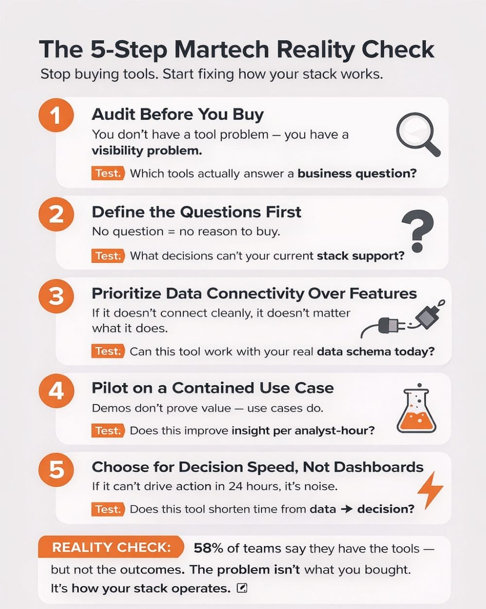 They can start to experiment to run the audit step on the current analytics layer alone — not the entire stack — before the next renewal cycle. Identify which tools in the analytics inventory are producing outputs that drive weekly decisions, which are producing outputs that appear in quarterly presentations and nowhere else and which are collecting data that no dashboard references. That audit alone will surface consolidation opportunities that reduce cost and complexity simultaneously.