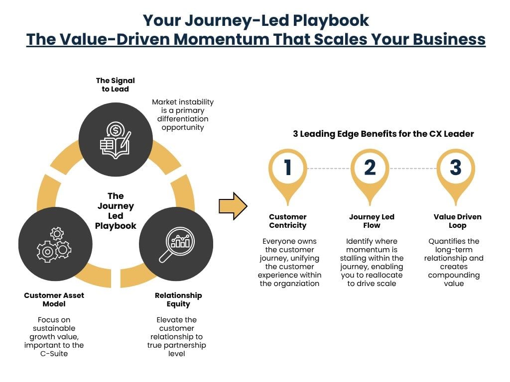 Let’s explore the three key strategies in your journey-led playbook: leading through market instability, aligning value to satisfy both the customer and the C-Suite, and building the Relationship Equity that scales your business.