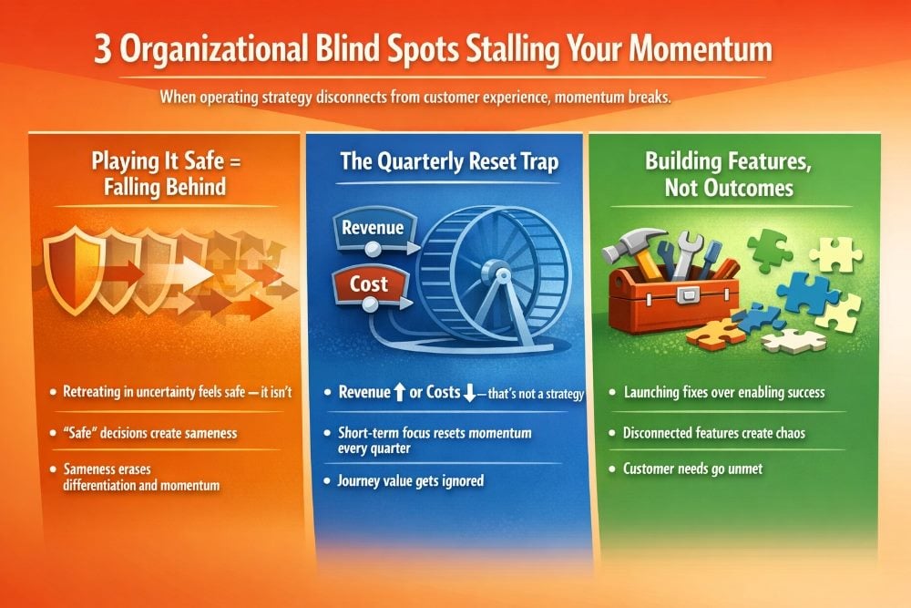 Rather than building compounding assets that strengthen a holistic journey, leaders bring to market disjointed features and fixes that fragment it. This isn’t executing for scale but increasing the complexity of a fractured experience. You stop fueling your own organization’s momentum the very moment you stop enabling your customer’s success.