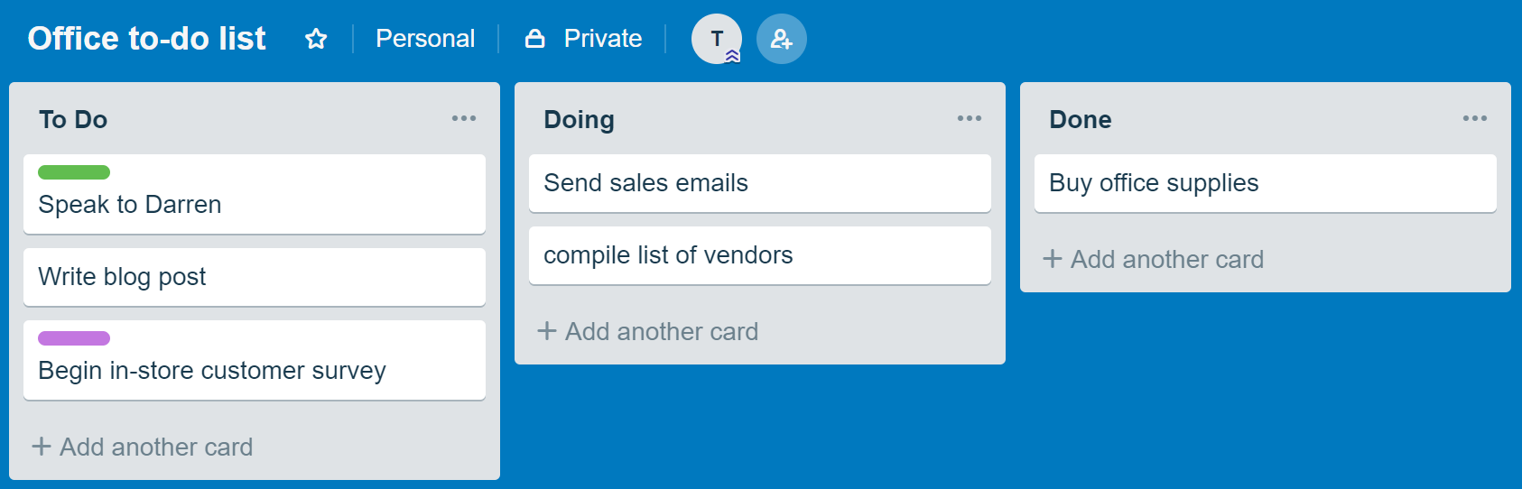 Each task is housed in a “card,” which then sits in a list. You can have as many lists as you like, a typical setup consists of three lists: to-do; work-in-progress; and completed. However, you can add and remove lists at will, and then drag-and-drop tasks across from one list to another as they get completed.