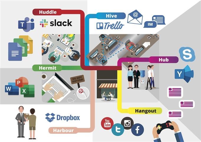 Hubs are all about chance encounters. The water cooler, cafe and corridors are all hub spaces in a central office. When everyone works from home, this mode is often the first victim because people have to be more proactive to move out of their default work mode (usually Hermit or Huddle). Lure people out of their Hermit mode with digest emails or cross-posting in other channels.