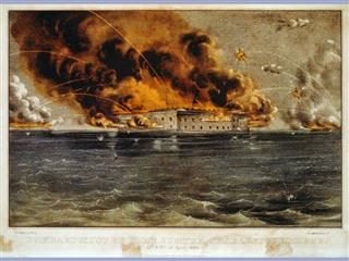 Title image of a picture print by Currier & Ives of the Siege of Ft. Sumter in the public domain