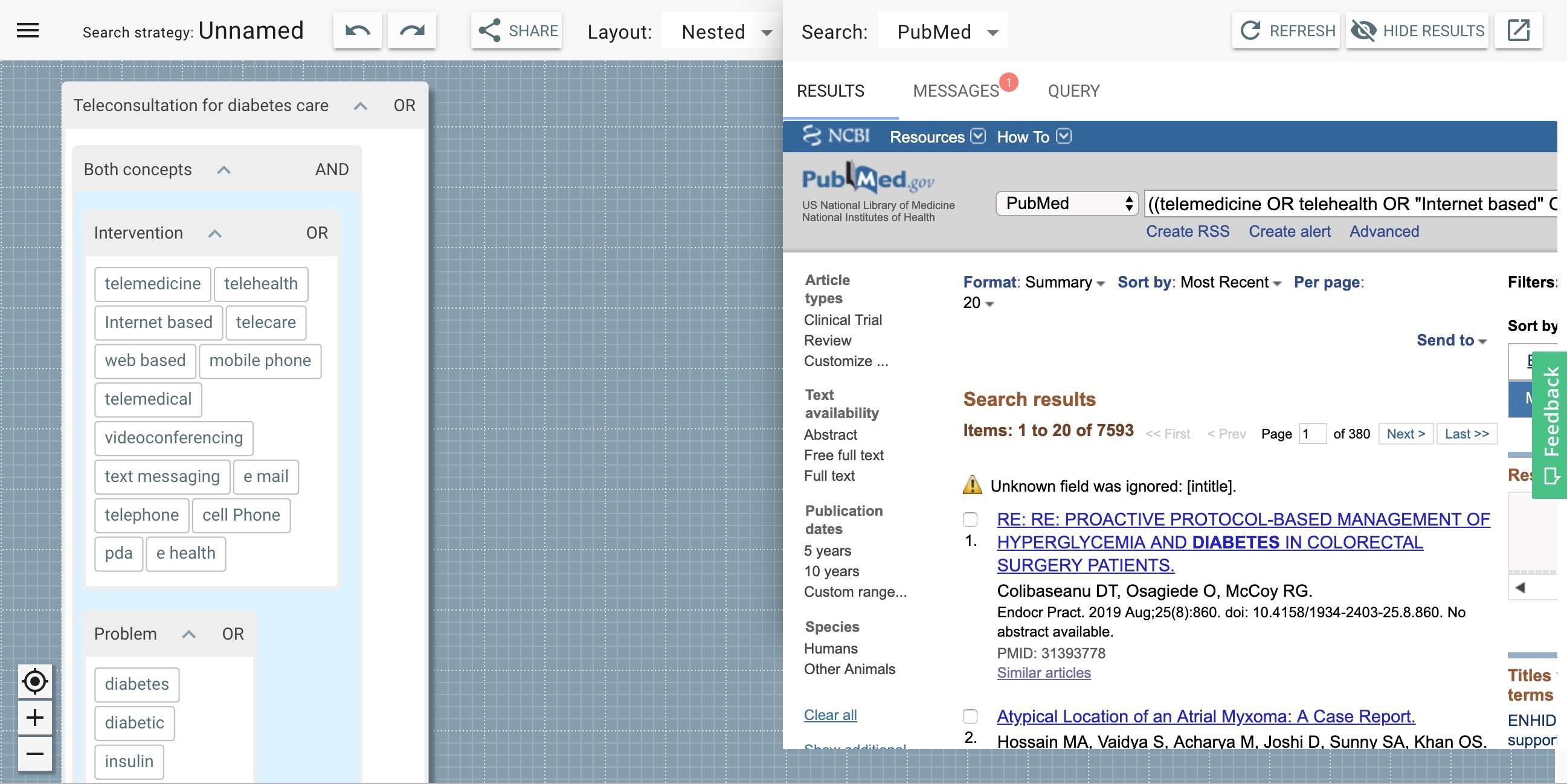The 2dSearch application is a major advance in managing structured searches from Tony Russell-Rose and his colleagues. Instead of entering Boolean strings into one-dimensional search boxes, queries are formulated by combining objects on a two-dimensional canvas. This eliminates syntax errors, makes the query semantics more transparent, and offers a more effective way to optimize, save and share search strategies. The screenshot below illustrates the approach more effectively than I can with words.
