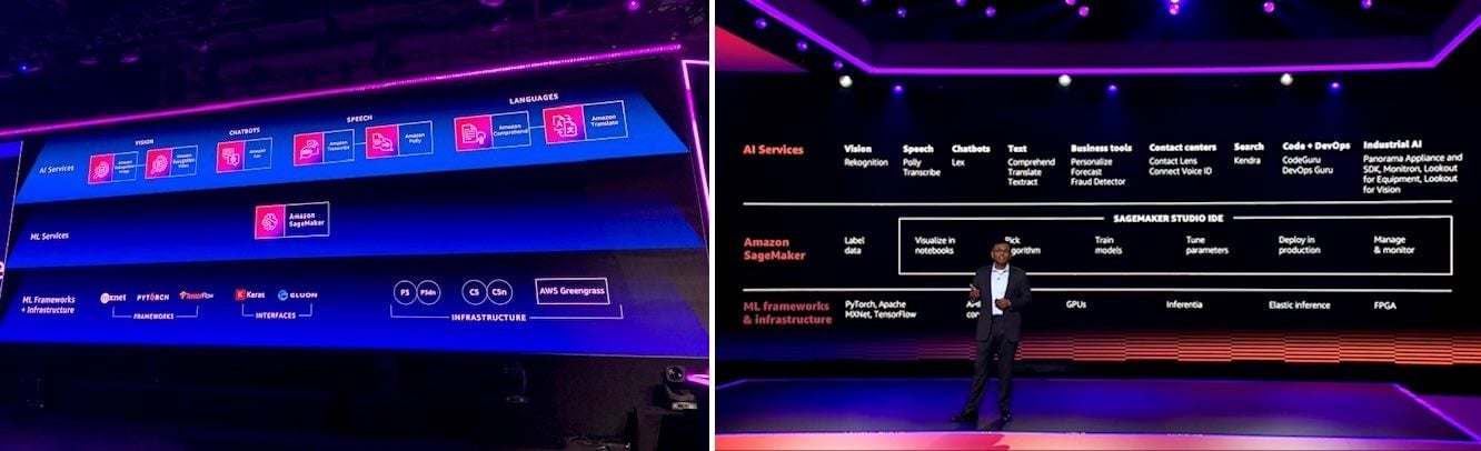 AWS breaks down its capabilities into three domains: frameworks and infrastructure; SageMaker; and AI services — its suite of off the shelf models, developer APIs and business solutions. Reinforcing its mission to "put machine learning into the hands of every developer and business," announcements covered all three of these domains this year, with a particular focus on SageMaker and higher-level, applied AI solutions in areas like business operations, contact centers and industrial and healthcare verticals.